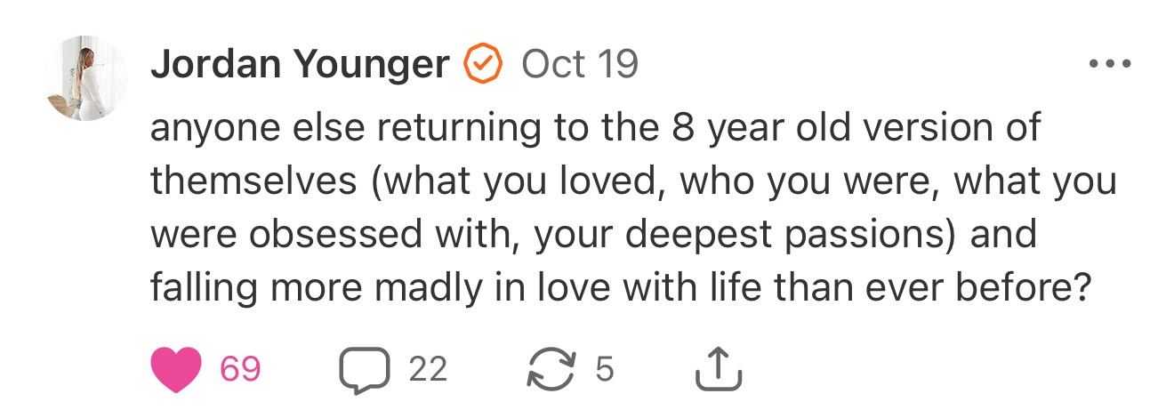 On Substack you’ll find the options to be a paid reader or a free reader, which of course is totally up to you. I post at least one free post a week, like I always used to do on this blog. And then for the deep dive content, the long form think pieces, the juicy and intimate content where we really *go there* (think of it like a speakeasy or a secret, VIP club) as well as the ability to join our subscriber group chat & beyond, that’s for paid subscribers!